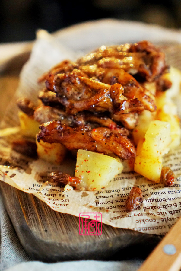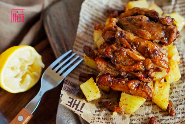 接下来将腌制好的鸡腿肉条,铺在放有土豆的烤盘上。