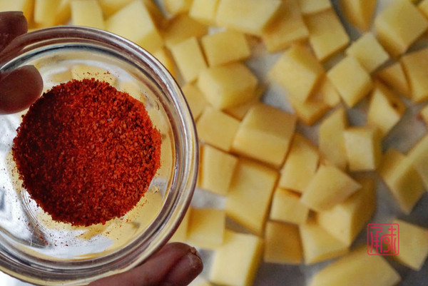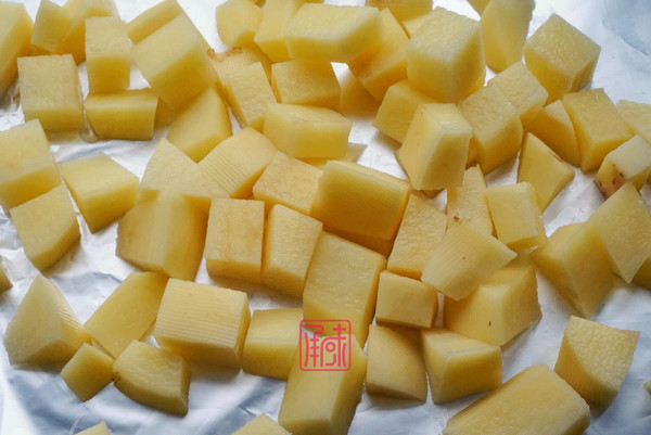 将土豆块散落放在有锡纸的烤盘上,在上边撒落一些葡萄干