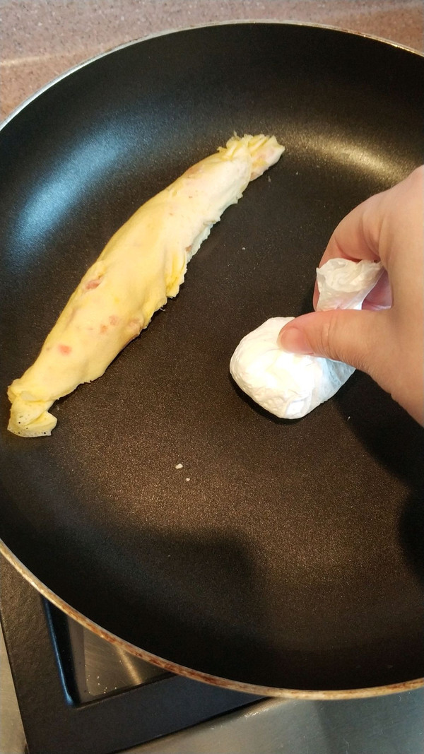 卷好后,再用“小啾啾”蘸油擦一擦锅。