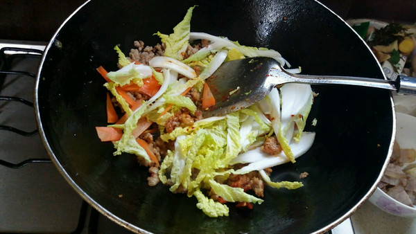肉末加适量盐、草果粉、酱油、淀粉拌匀,下锅炒至变色。