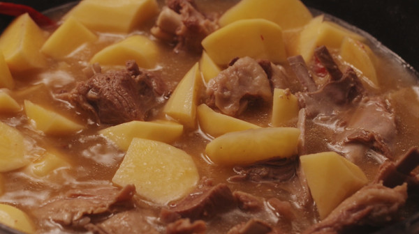 放入切块的土豆煮至变软,调大火收汁,出锅前撒入大葱碎。