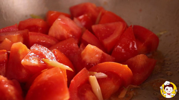 另起锅,加入葱白和西红柿块大火不断翻炒至西红柿起沙。