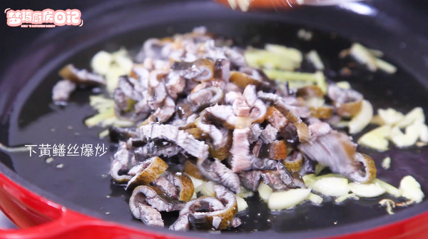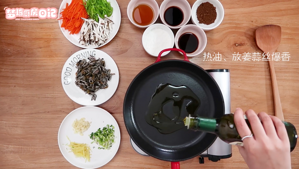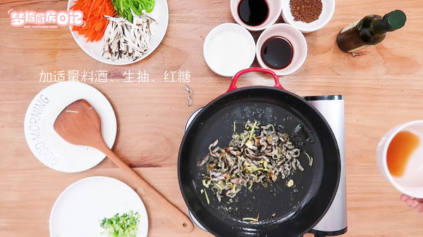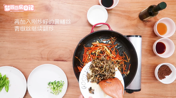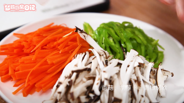 另起一个热锅,热油翻炒胡萝卜和香菇丝。