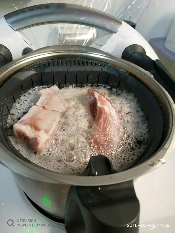 时间5分钟,温度50度,速度4,洗肋排,把血水和脏东西都洗出来,清水清洗后备用。