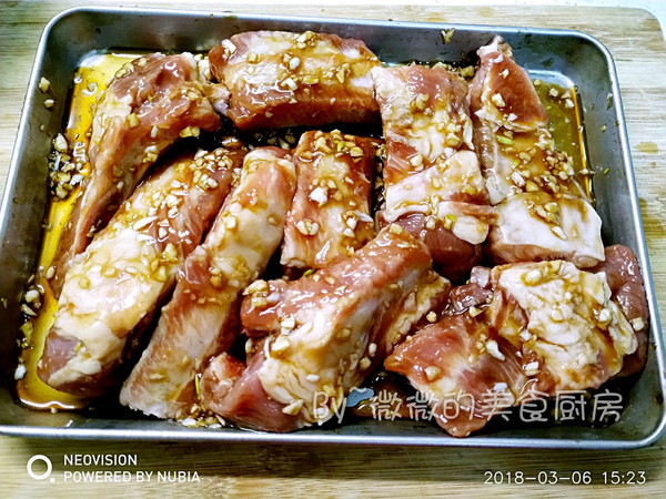 腌制好的肋排,上面再倒入爆香好的蒜油,用锡纸全部包住后进烤箱。 烤箱设定上下火230度,40分钟, 这40分钟是这样安排的, 盖上锡纸烤20分钟,打开锡纸烤10分钟,肋排翻个再烤10分钟。