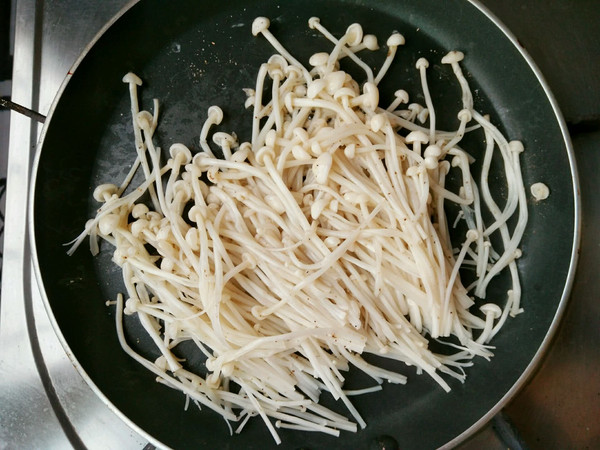 平底锅预热一下,不用放油,放入金针菇,撒上一丢丢的椒盐粉。