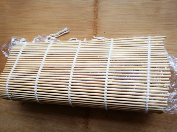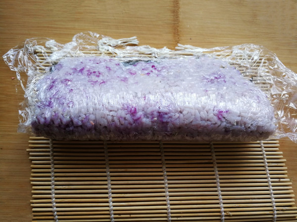 卷帘上铺一层保鲜膜,保鲜膜上铺海苔,海苔上面铺一层深色的米饭铺云,再翻过来,使米饭与保鲜膜贴合。海苔面朝上。