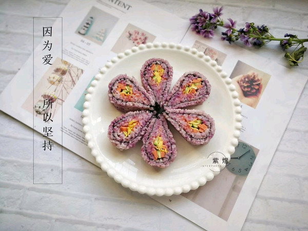 取一小部分米饭拌入紫薯粉,做花朵外层颜色。