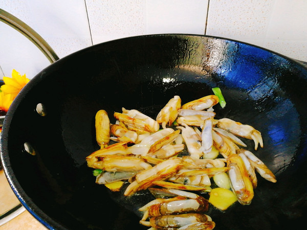 将蛏子倒入大火快速翻炒,但手劲不能太大,蛏子的壳比较容易碎