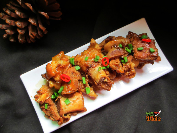 盖盖子继续煮大概20分钟,一定要看着锅,不要让酱糊锅,煮烂后汤汁要保持剩骨头的一半左右,肉糊烂了就好要留汤,不能熬干