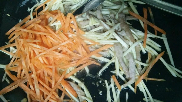 炒至茭白丝稍变软加入胡萝卜丝继续翻炒。