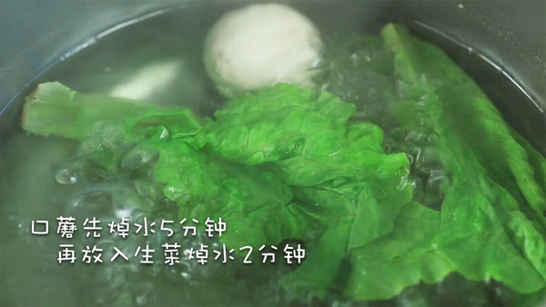起锅烧水,水开后放入口蘑先焯水5分钟,再放入生菜焯水2分钟。