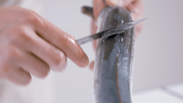 在60~70度的热水中浸泡10~15秒,捋去表层白痧后,再用小刀轻刮干净;