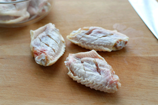 鸡翅中洗净后在背面划几道口子方便入味,如果不追求颜值可以在正反面都划几道