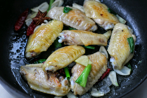 小火将鸡翅两面煎成焦黄色,要经常翻面,以免鸡翅糊掉