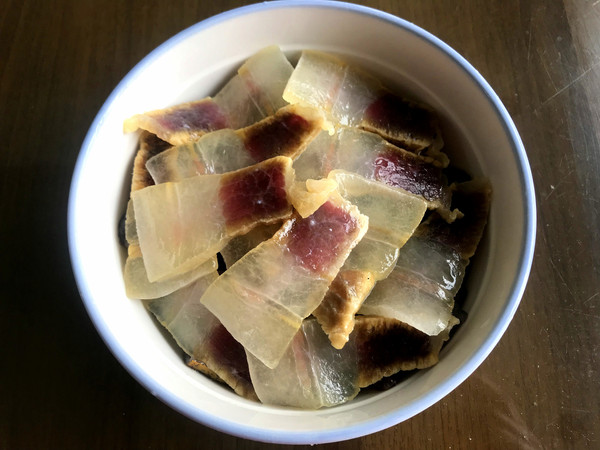 将鳝段铺在海碗的底部,表面均匀地码上腊肉片。