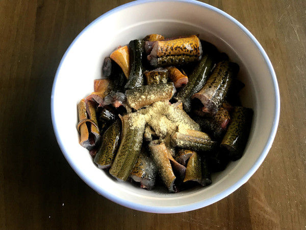腌好的黄鳝倒去腌汁,用清水迅速冲洗一下,沥净水备用。