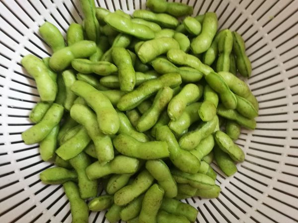 将搓洗干净的毛豆沥水,用剪子剪去两头尖角备用