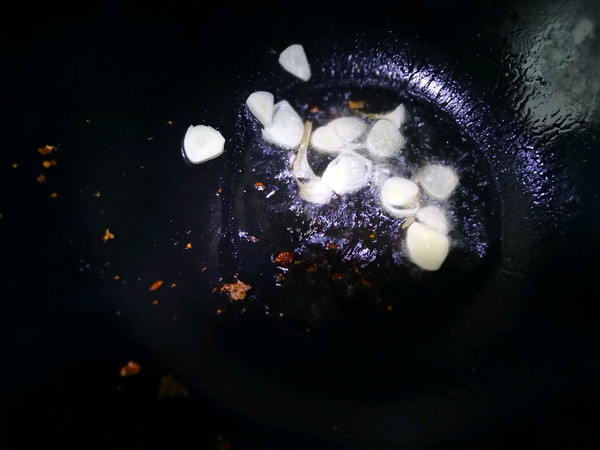 锅内余油放入蒜片爆香,加盐糖。