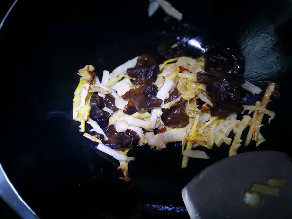 先放笋片,木耳,水,稍煸炒。