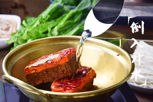 将三生川火锅底料一分为二,放入锅中,倒入加开水;