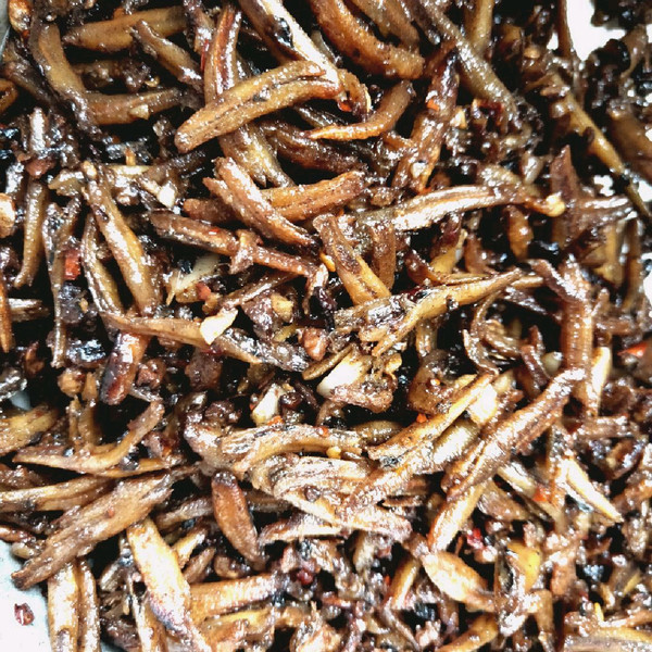 第六步:倒入少量油,放入多点大蒜、少量生抽、辣椒、孜然粉。把鱼仔统一倒入进去搅拌即可出锅。美味佳肴
