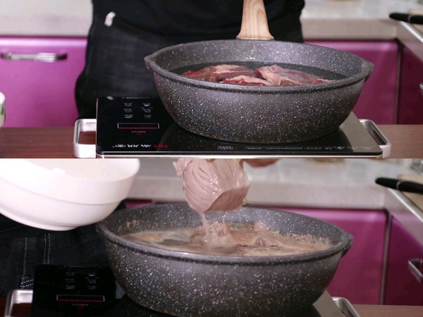 姜切厚片,蒜轻压,将用清水浸泡一小时的牛肉,切成长条