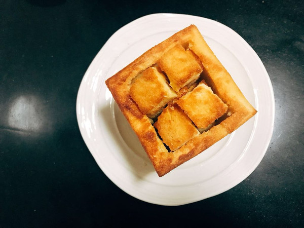 土司用刀子在四边切一下,推出来,底部那一片再放回去。中间的土司切成块,我切的大小有点随意了些。