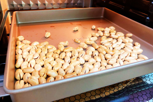 把冷冰好的花生米拿出来,码在烤盘上,送进不用预热的烤箱中上下火150度30分钟