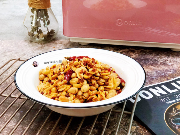 面包机启动炒干果功能,面包机桶内倒入20g的花生油,把花椒,干辣椒冷油放入,加热至搅拌叶搅动就可倒入烤好的花生米,然后就开始调味了,加入盐啦,再加入细砂糖啦