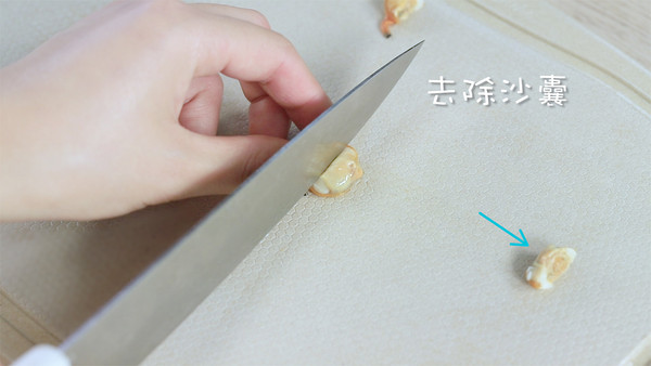 焯好的蛤蜊,捞出冷却后取肉,去掉内脏沙囊。 »蛤蜊的内脏有很多的脏东西,给宝宝吃的时候一定要去掉哦。