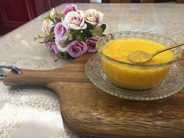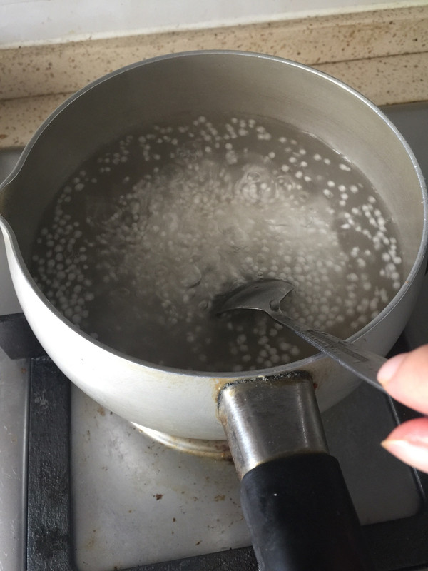 锅内放入纯净水,煮开。加入西米,小火慢煮,注意间隔一会儿用勺子沿顺时针方向搅动,避免锅底粘锅。20分钟后,关火,盖上锅盖焖一会儿。