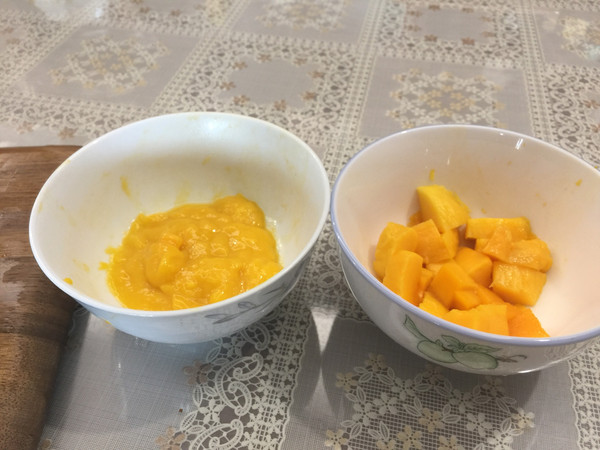 一半搅泥,可加入适当冰块(秒变芒果冰沙哦)一半切成更小块备用。