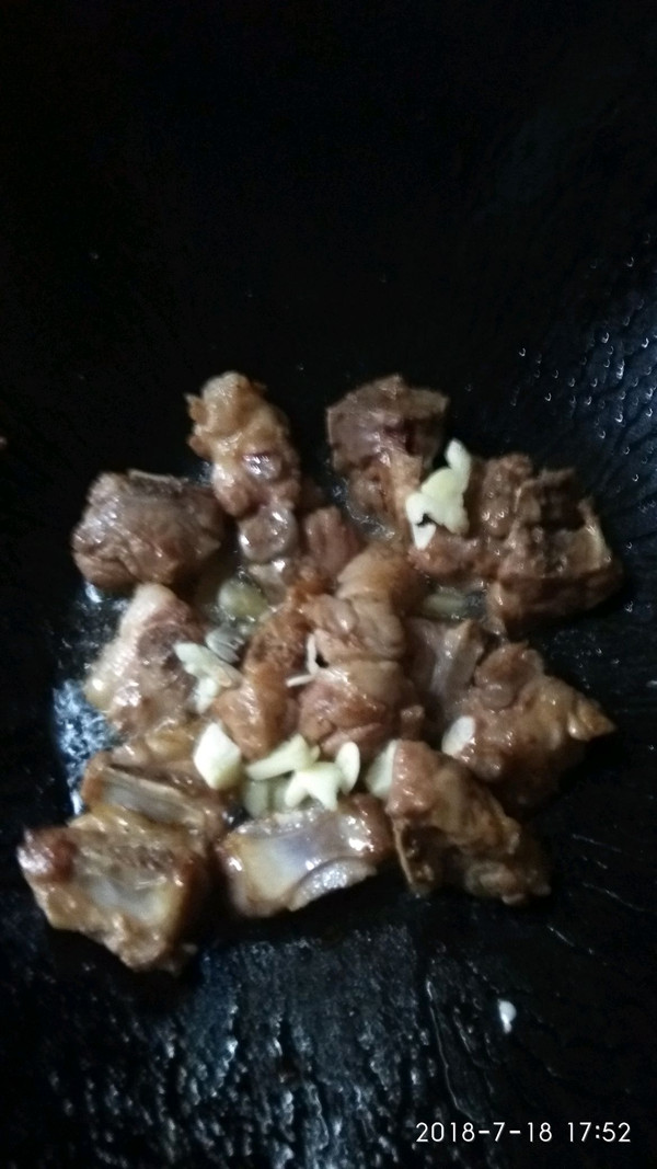 5排骨煎微黄,加入蒜炒一下,加入半碗水,大概50ml,加入酸梅,中火焖干,记得不用盖盖子。