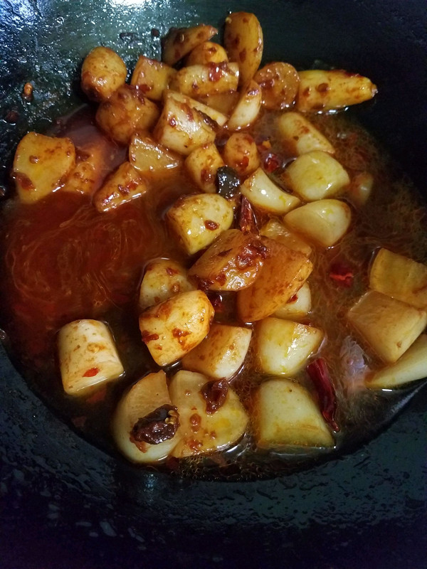 酸萝卜切滚刀,翻炒片刻加郫县豆瓣酱