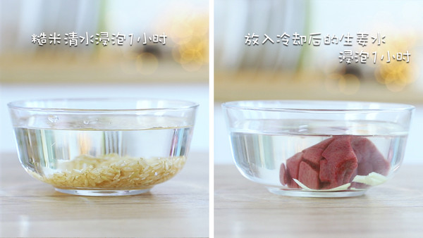 糙米清水浸泡1小时;猪肝放入冷却后的生姜水,浸泡1小时。
