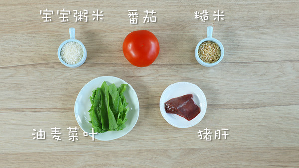 准备食材:猪肝30克 糙米30克 番茄50克 油麦菜叶10克 宝宝粥米30克