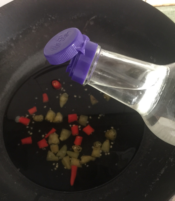 小米椒、泡椒切段。
