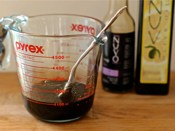 搅拌混合美亚柠檬橄榄油 (1/4 cup) ,无花果香醋 (3 tablespoon) ,蜂蜜 (1/2 tablespoon) 和盐 (1/4 teaspoon) 直至乳化。