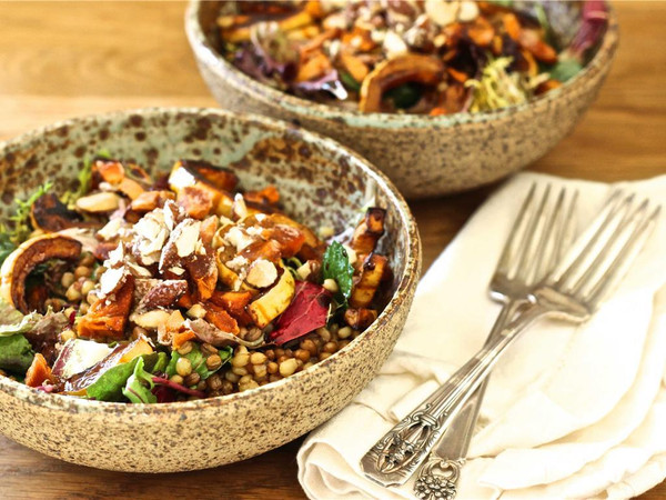 现在开始装盘。在两个碗的底部分别铺上1杯沙拉用绿叶菜 (2 cup) ,加入煮过的谷物,淋上酱汁,再放上南瓜。最后用柿子块和杏仁装饰,直接食用就可以啦!