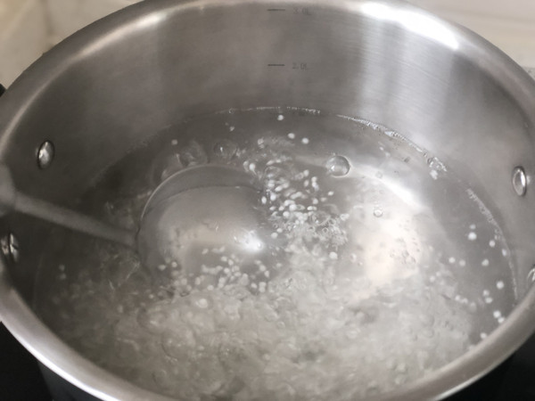 准备一口大深口汤锅,烧一大锅水,水开后,把西米倒入锅中,让西米随着水波散开,滚动。