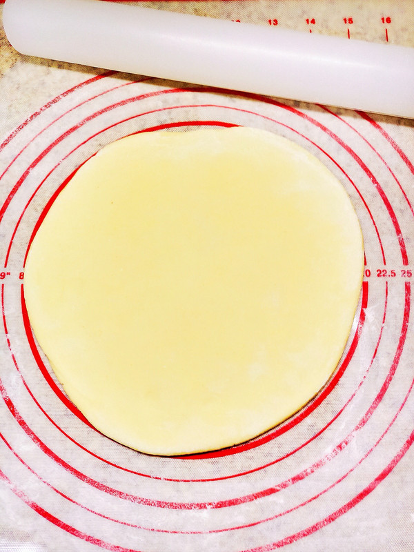 将面粉揉成较硬的面团状,垫子上撒上干面粉,用擀面杖擀成薄厚一致的圆片状~