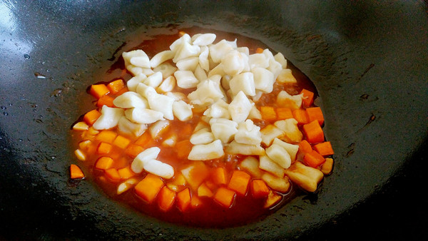 锅烧热放油扔胡萝卜跟蒜,小火煎香了加番茄酱进去随便扒拉两下