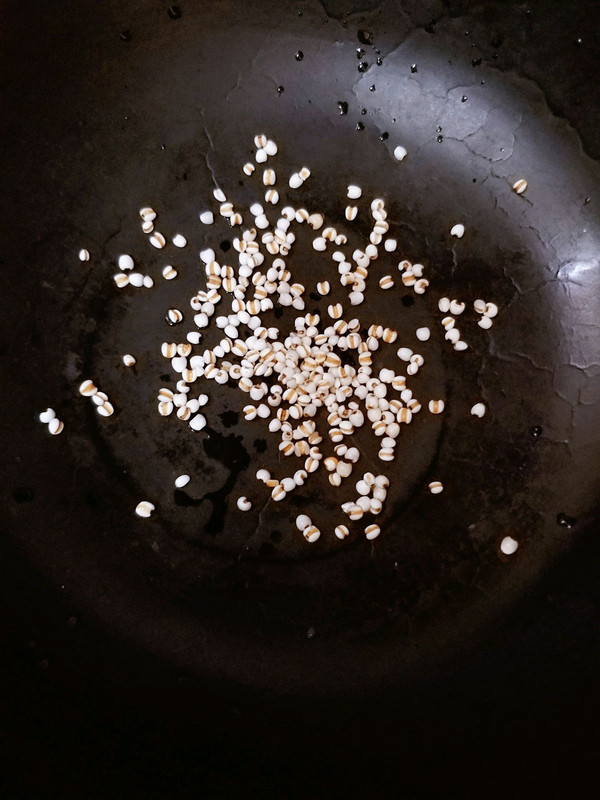 把薏米洗干净炒熟,薏米一定要炒,小火慢慢炒直到颜色变了略微爆起来就行。