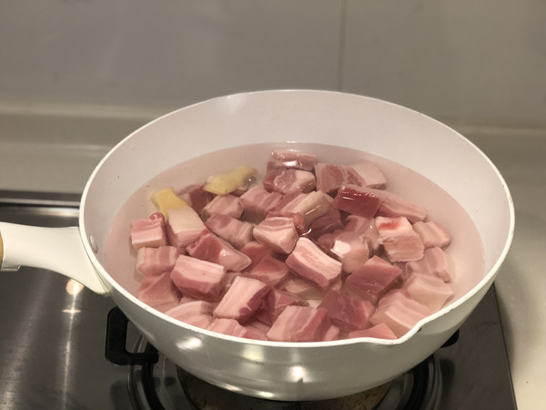 带皮的五花肉切成麻将块,然后洗净放入冷水下锅,放姜片,水开后捞出沥干水分备用