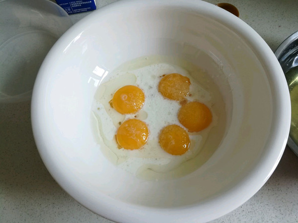 15g白糖30g食用油65g鲜牛奶加入蛋黄中搅拌均匀