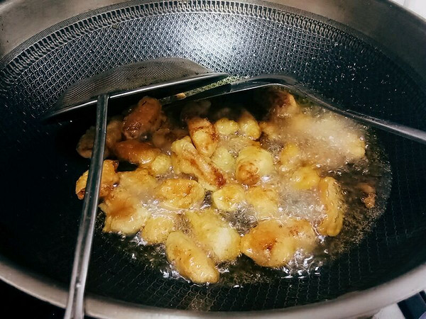 等油温升高,再次放入肉段大火复炸。