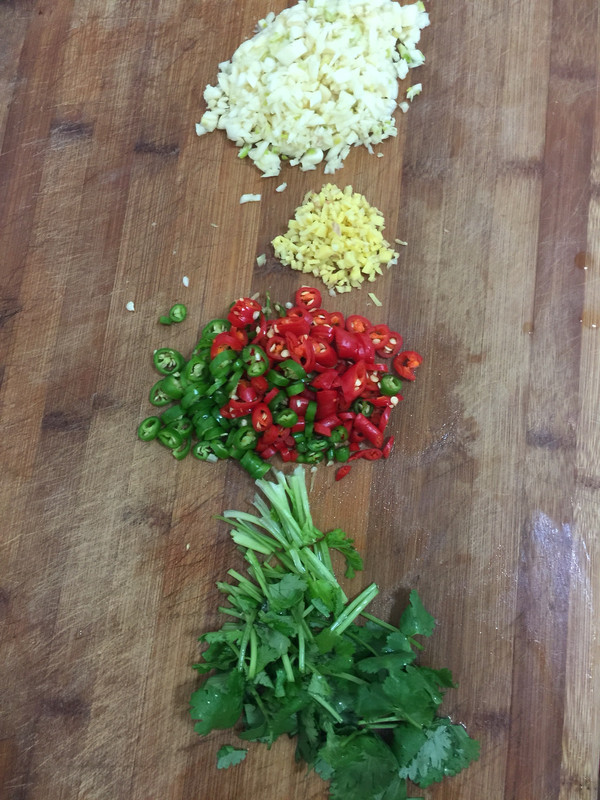 蒜瓣剥皮剁碎,生姜切成末,青红尖椒切成圈儿,香菜洗净切成段儿备用。