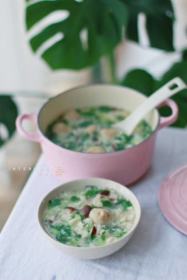 当疙瘩煮熟后,下入切碎的青菜香菇,并加盐调味。