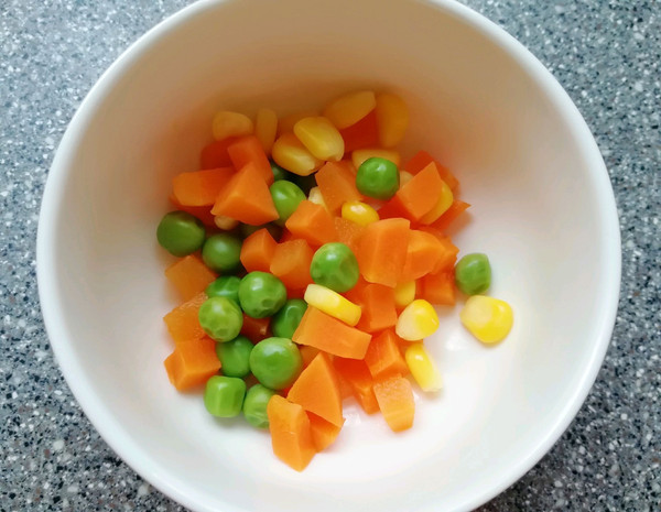 胡萝卜洗干净切成小丁,和青豆玉米粒一起焯熟。